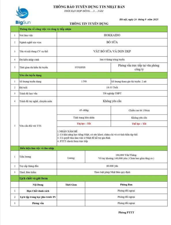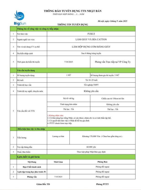 THÔNG BÁO TUYỂN DỤNG CÁC ĐƠN HÀNG THÁNG 09.2025